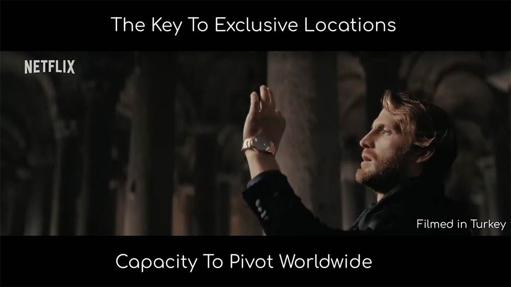 In Iceland, the HBO TV series The Flight Attendant secured a permit for the difficult-to-book Sky Lagoon spa purely because the owners trusted our local PSC’s track record. Similarly, in Turkey, the cathedral-sized underground Cistern Basilica—where even Netflix Turkey had previously failed to gain access—was secured through the expertise of our Istanbul-based PSC.